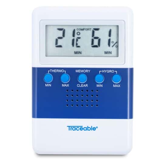 Whether used in a lab for experiment validation or in an industrial setting for quality assurance, this thermohygrometer helps maintain optimal environmental conditions. The compact, lightweight design allows for portability, while the intuitive interface simplifies operation. Meter features a large LCD with 5/8” high digits that can be read from as far as 20 feet away. Chemical- and shock-resistant ABS plastic case offers durability.