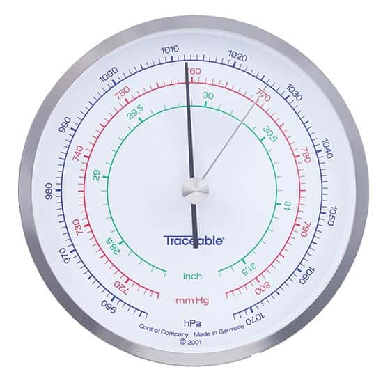 Three-scale dial barometer measures atmospheric pressure in millibar (mbar), inches Hg, and mm Hg. Set the adjustable pointer to measure changes in pressure. The barometer is housed in corrosion-proof nickel-chrome case.